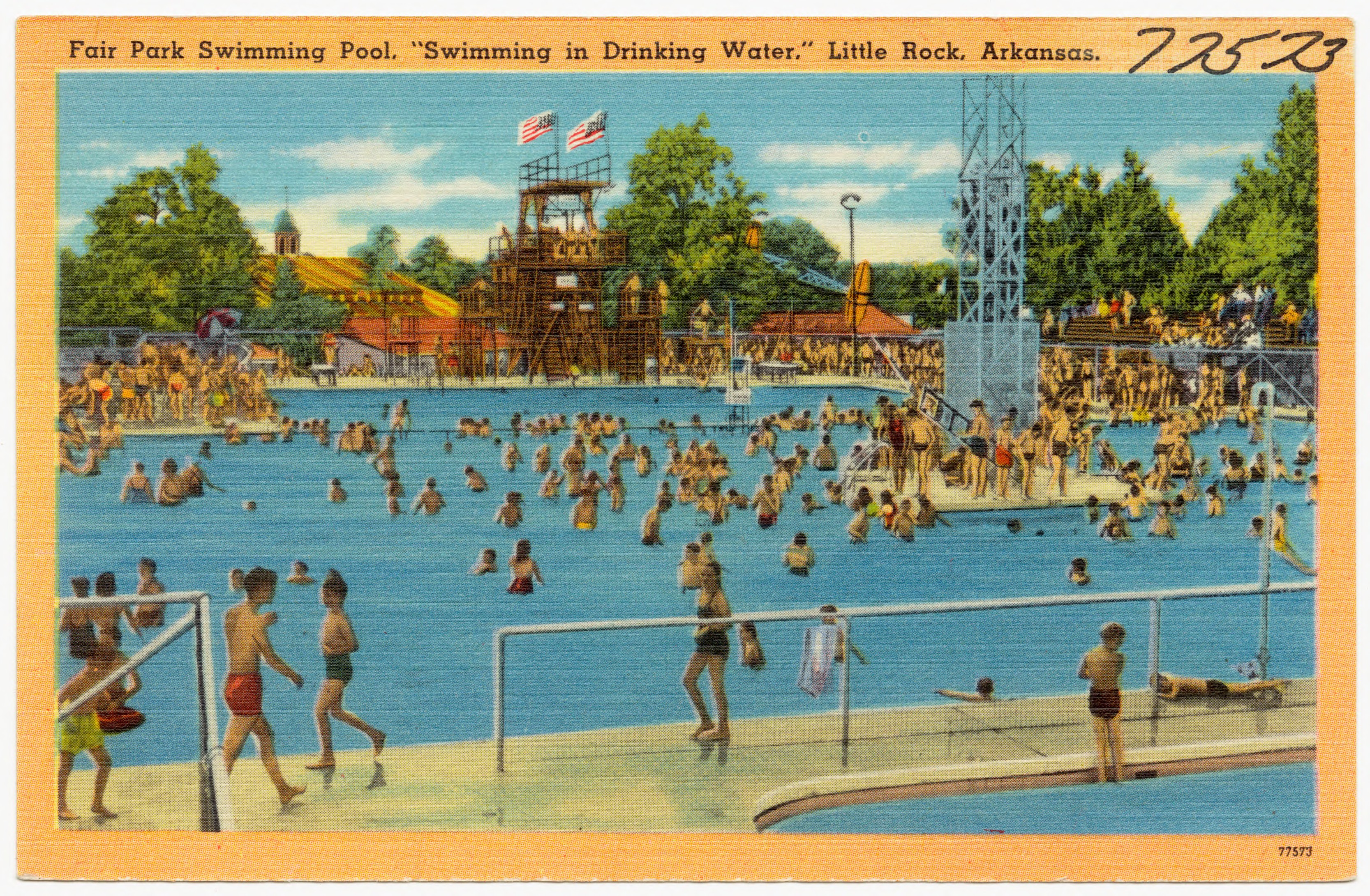Hot climates and swimming go together. Nowadays pools tend to be plain and built in cookie cutter fashion, as are playgrounds. Diving boards are gone due to liability concerns. That wasn't always the case, though, and I thought it would be fun to remember the days when communities, not just high-end hotels, built delightful municipal swimming pools.